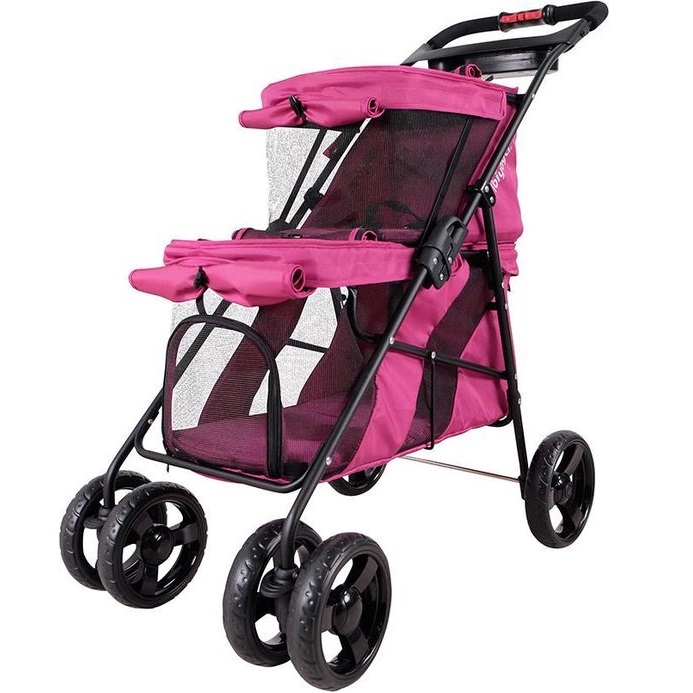 De Ibiyaya Dubbeldekker Hondenbuggy heeft 2 individuele cabines om jouw honden te vervoeren. Elke cabine heeft een raampje van gaas om dicht te ritsen en lijntjes om de honden aan vast te zetten. Aan de achterkant zit een rem voor extra veiligheid en vooraan zwenkwielen voor stabiliteit. De buggy heeft een roze kleur en is eenvoudig in te klappen. Het maximale draaggewicht is bovenaan 6 kg, en onderaan 15 kg.