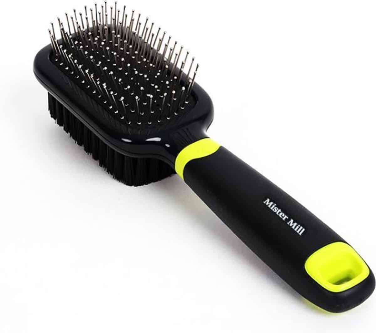 Deze combi-hondenkam van Mister Mill is dubbelzijdig. Aan de ene zijde bestaat de borstel uit metalen pennen en aan de andere zijde uit zachte nylon haren. Mister Mill belooft dat deze borstel perfect is voor professionele trimmers en thuisgebruik. De nylon zijde van de borstel is perfect voor elke vacht en de stalen zijde wordt aangeraden voor honden met een lange vacht.