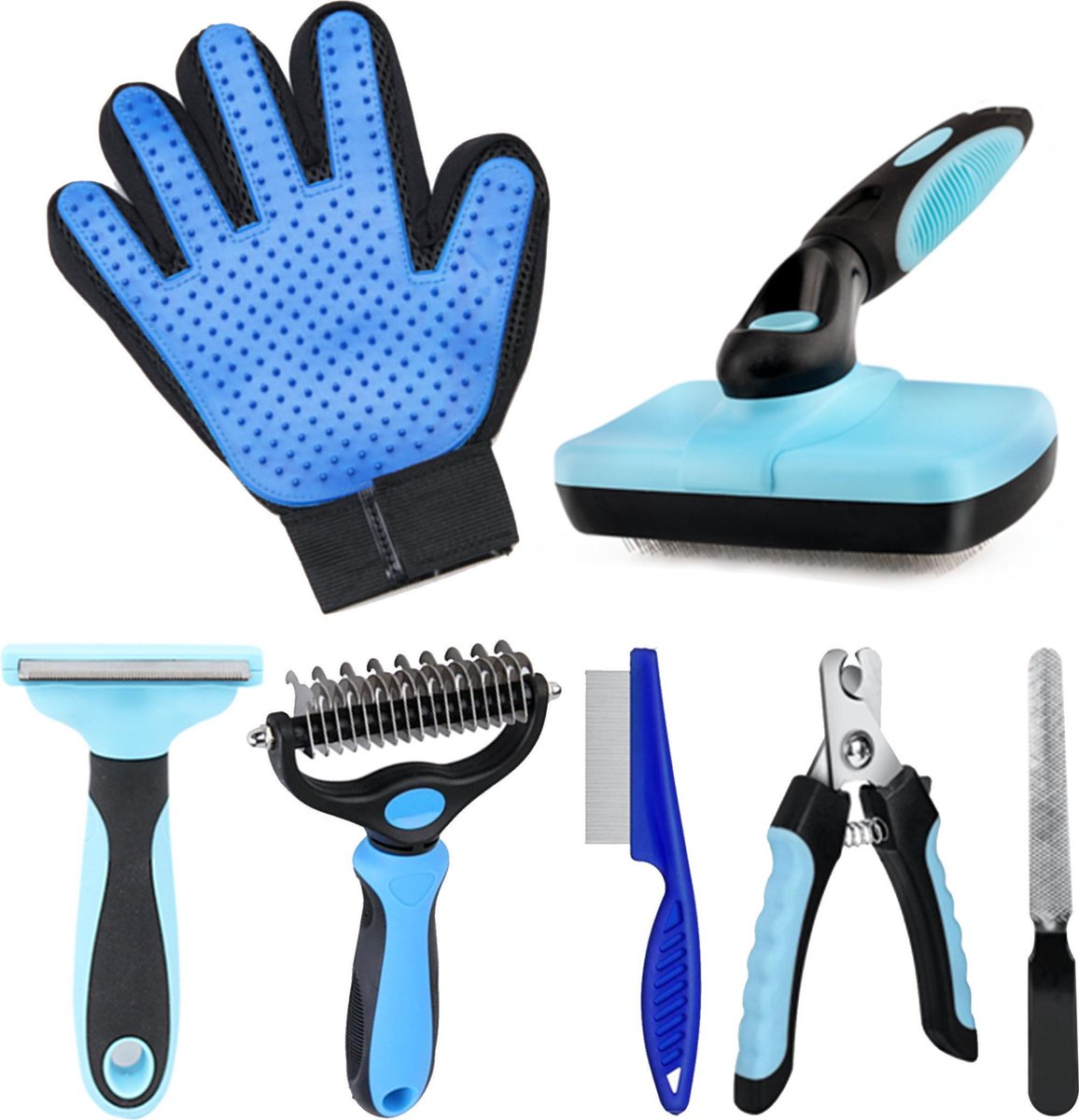 De hondenkamset van RoiPets komt met alles wat een hondenvacht nodig heeft. Deze luxe hondenvacht set bestaat uit een 2-in-1 ondervachtkam, zelfreinigende kam (1 druk op de knop haalt alle haren uit de borstel), een massagehandschoen, Furminator-kam, nagelknipper, nagelvijl en een vlooienkam. Alle producten zijn gemaakt van hoogwaardige materialen en zijn blauw met zwart gekleurd. Verder biedt RoiPets een 100 procent tevredenheidsgarantie.