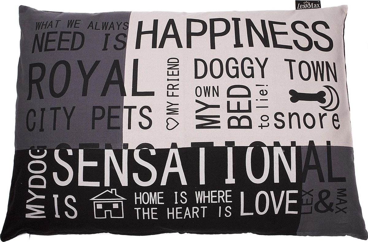 Een ligkussen met een mooie hoes, want het oog wil ook wat! Lex & Max Happiness hondenkussen heeft een prachtige, wasbare buitenhoes. Het is aan de bovenkant bedrukt met leuke teksten en afbeeldingen. De kleurstelling is antraciet en grijs en daarmee geschikt voor praktisch ieder interieur. Voor je hond is het kussen lekker zacht. De vulling is van acrylvezel. Deze vezel reflecteert de lichaamswarmte zodat je hond heerlijk warm blijft. Dit soort vezels zijn hol waardoor het volume langer behouden blijft.