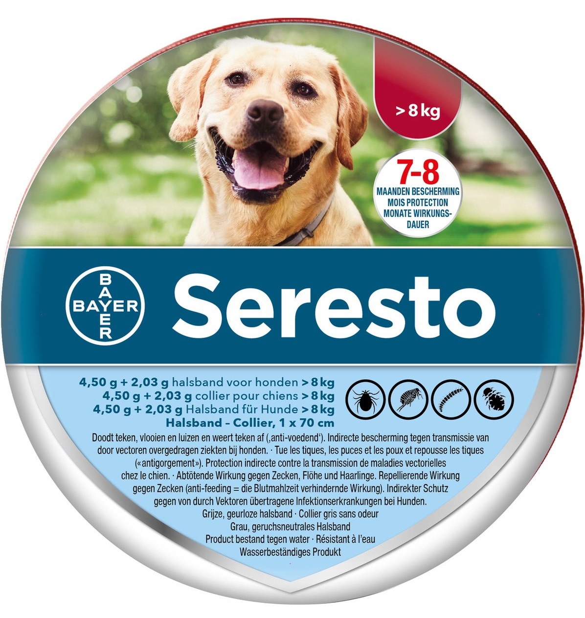Deze band doodt naast vlooien en teken ook luizen. Ook voorkomt het dat vlooienlarven zich in je huis kunnen vermeerderen. Daarnaast vermindert de band het risico op infectie met Leishmania, overdraagbaar door zandvliegjes. Dit is vooral belangrijk als je hond mee naar het buitenland gaat. Dit model is geschikt voor honden groter dan 8 kilogram, maar de Seresto band is ook te koop voor kleinere en grotere honden. De Seresto vlooienband is niet geschikt voor puppy's jonger dan 7 weken.