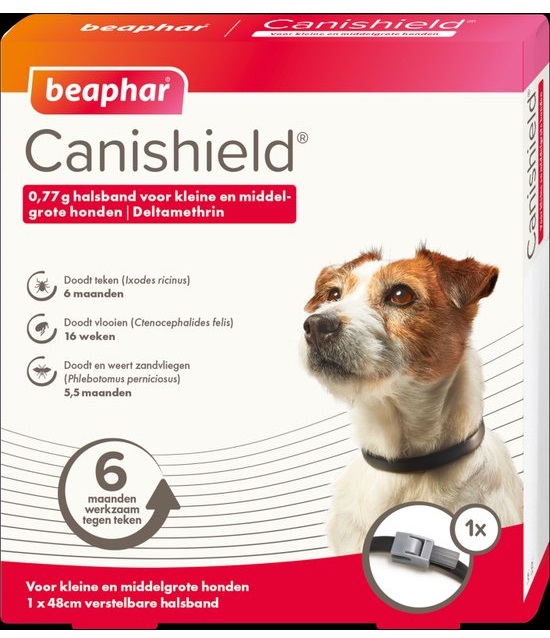 De Beaphar Canishield is een vlooienband speciaal ontworpen voor jouw hond, met een krachtige werking tegen vlooien, teken en zandvliegen. De band, die geschikt is voor kleine en middelgrote honden, is ideaal om ook bij je puppy om te doen. Dit is veilig al vanaf een leeftijd van 7 weken. Je kunt de band eenvoudig op maat knippen voor een comfortabele pasvorm.