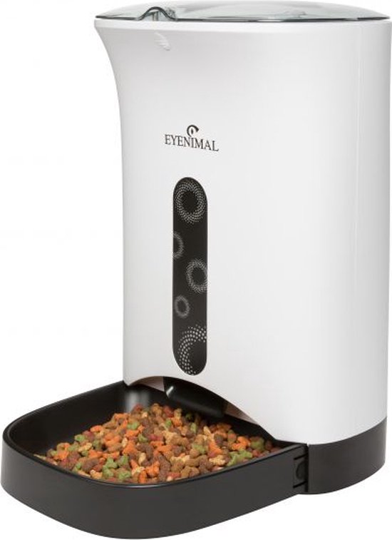 Het Eyenimal voerautomaat is een automatische honden bak die tot 12 keer per dag kan laten weten dat het etenstijd is. Dit gebeurd door een stemopname van 10 seconden. De voerbak is eenvoudig te programmeren via het LCD-scherm, waar ook het batterijniveau op terug te vinden is. In het reservoir kun je tot 1,7 kg aan droge hondenvoeding kwijt. Bovendien is het apparaat makkelijk schoon te maken.